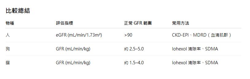 「eGFR」(estimated Glomerular Filtration Rate,估計腎絲球過濾率)是用來評估腎臟功能的重要指標。雖然人、狗、貓都有腎臟和腎絲球過濾功能,但牠們的正常eGFR值和計算方式是不同的。以下是針對人、狗、貓的概述: