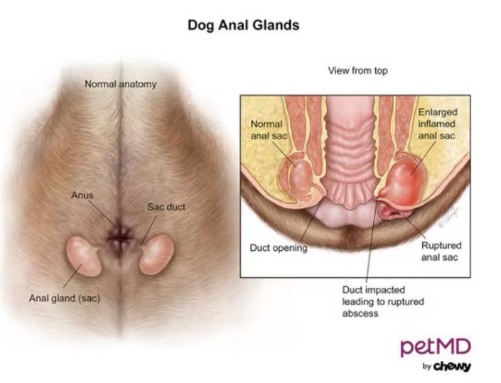 如果肛門腺口阻塞,將使得其內充滿過多液體,導致尾肛腺腫脹。這時,動物因為感到很不舒服,所以會有磨擦或過度舔舐肛門的情形,以求得紓解。如果您仔細觀察,有時可以看到動物後腿向前伸直,臀部著地,將肛門口拖在地上磨擦的滑稽模樣。假若腫脹的情形再不獲改善,那麼肛門腺就會發炎、形成膿腫、甚至破裂,波及周邊組織。